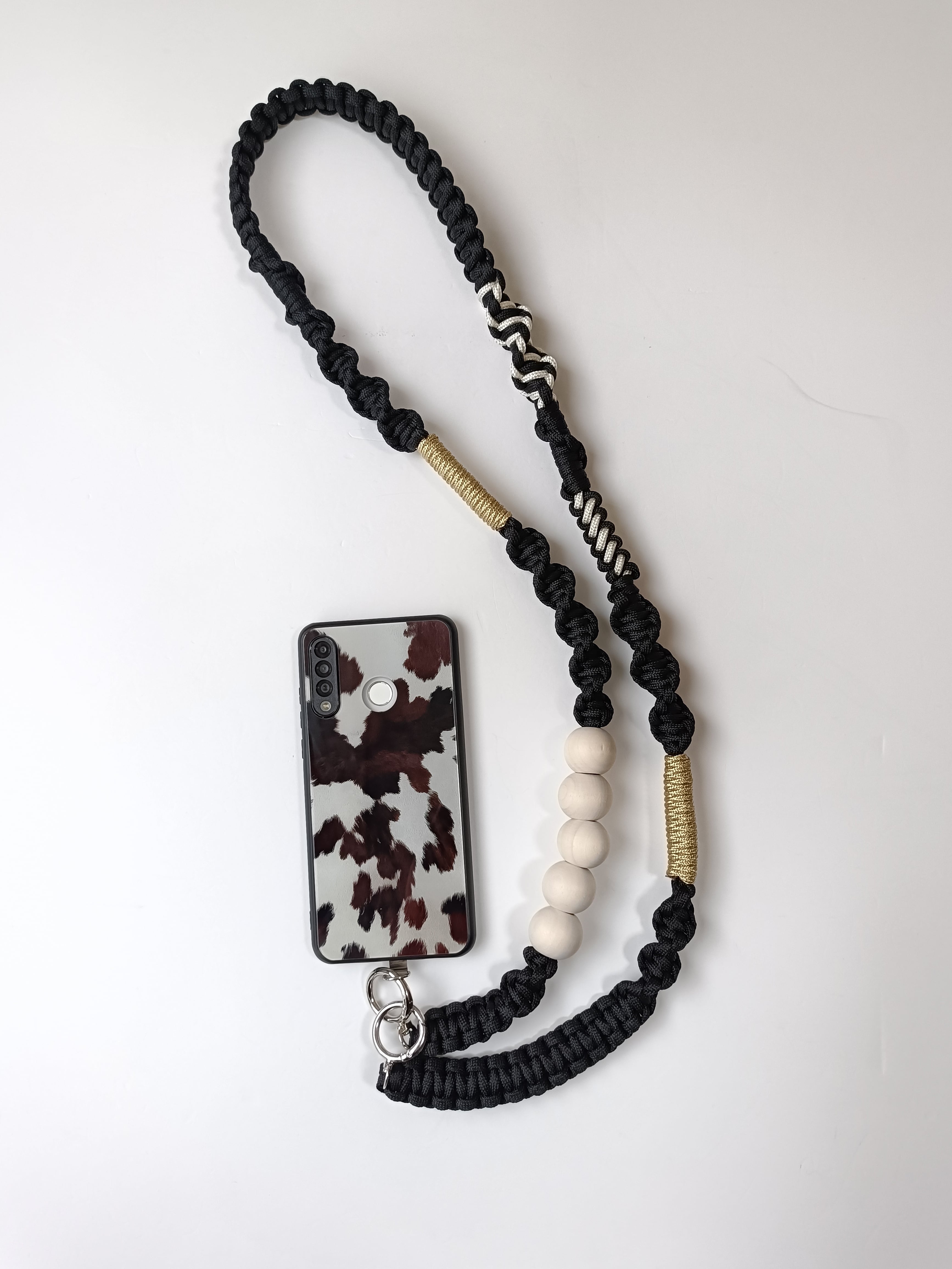 038/スマホショルダー/パラコード/ウッドビーズ/クリーム×ブラック×ゴールド