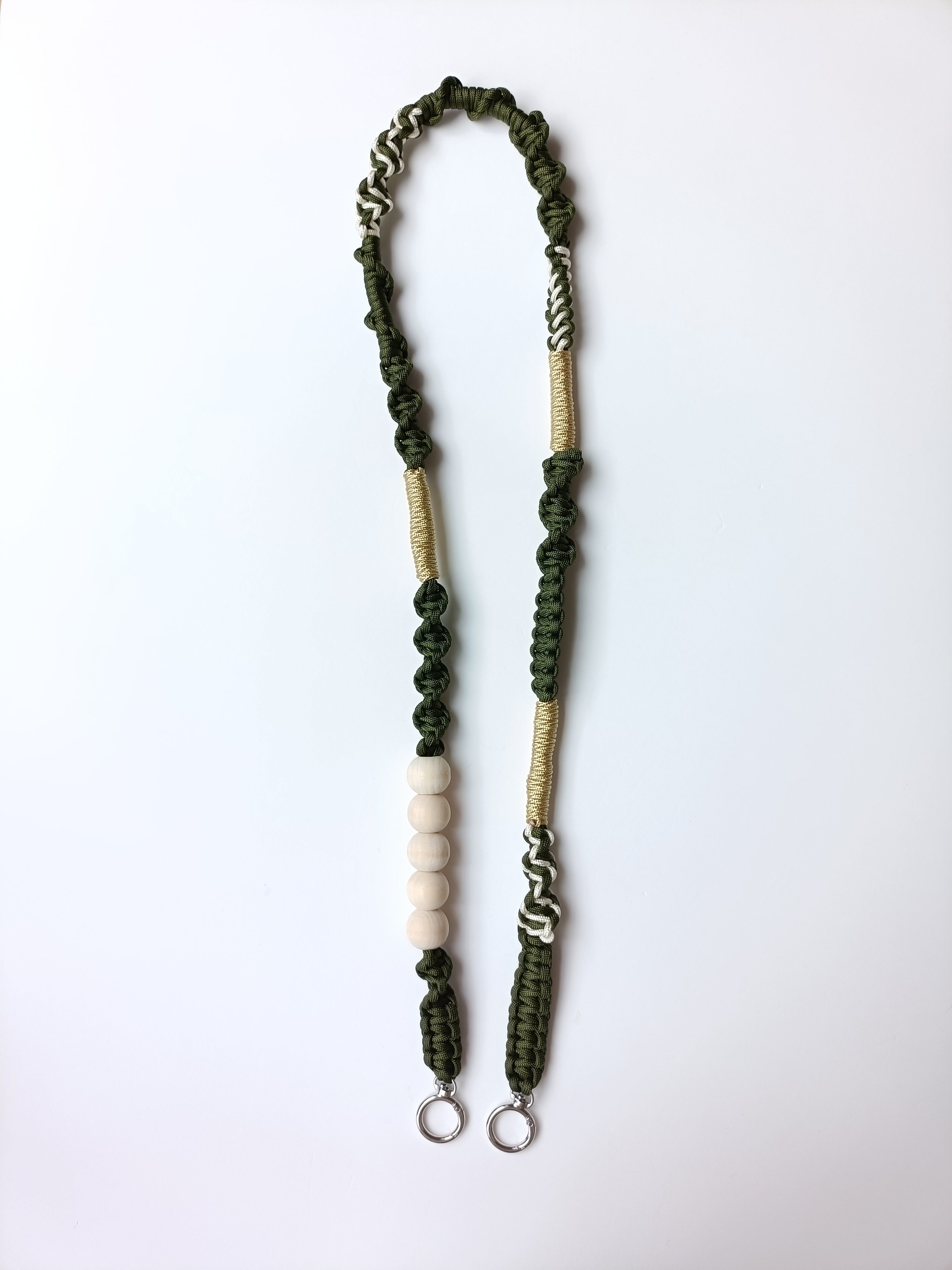 042/スマホショルダー/パラコード/ウッドビーズ/クリーム×カーキ×ゴールド