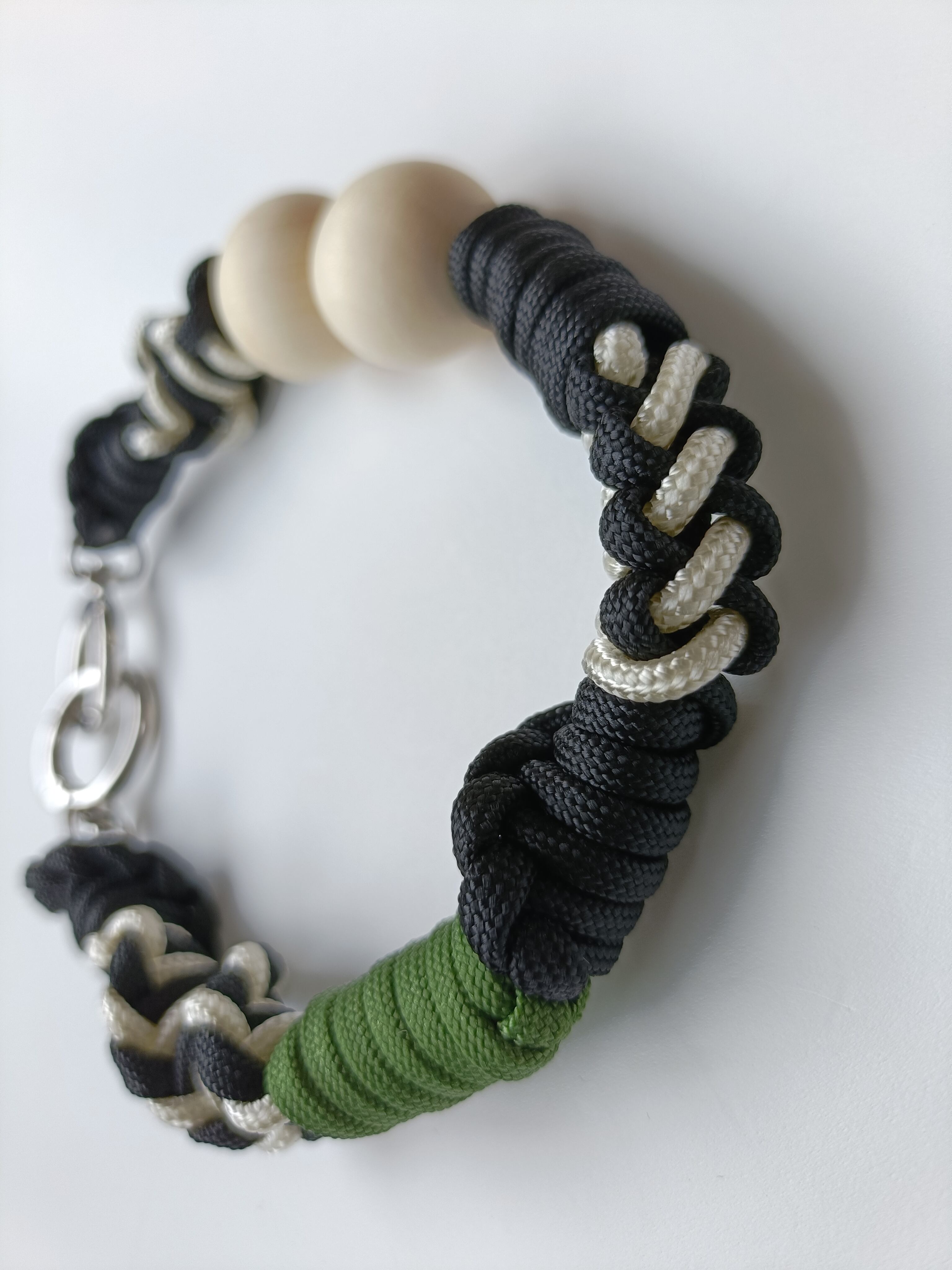 ハンドストラップ028/パラコード/ブラック×クリーム×グリーン×ウッド