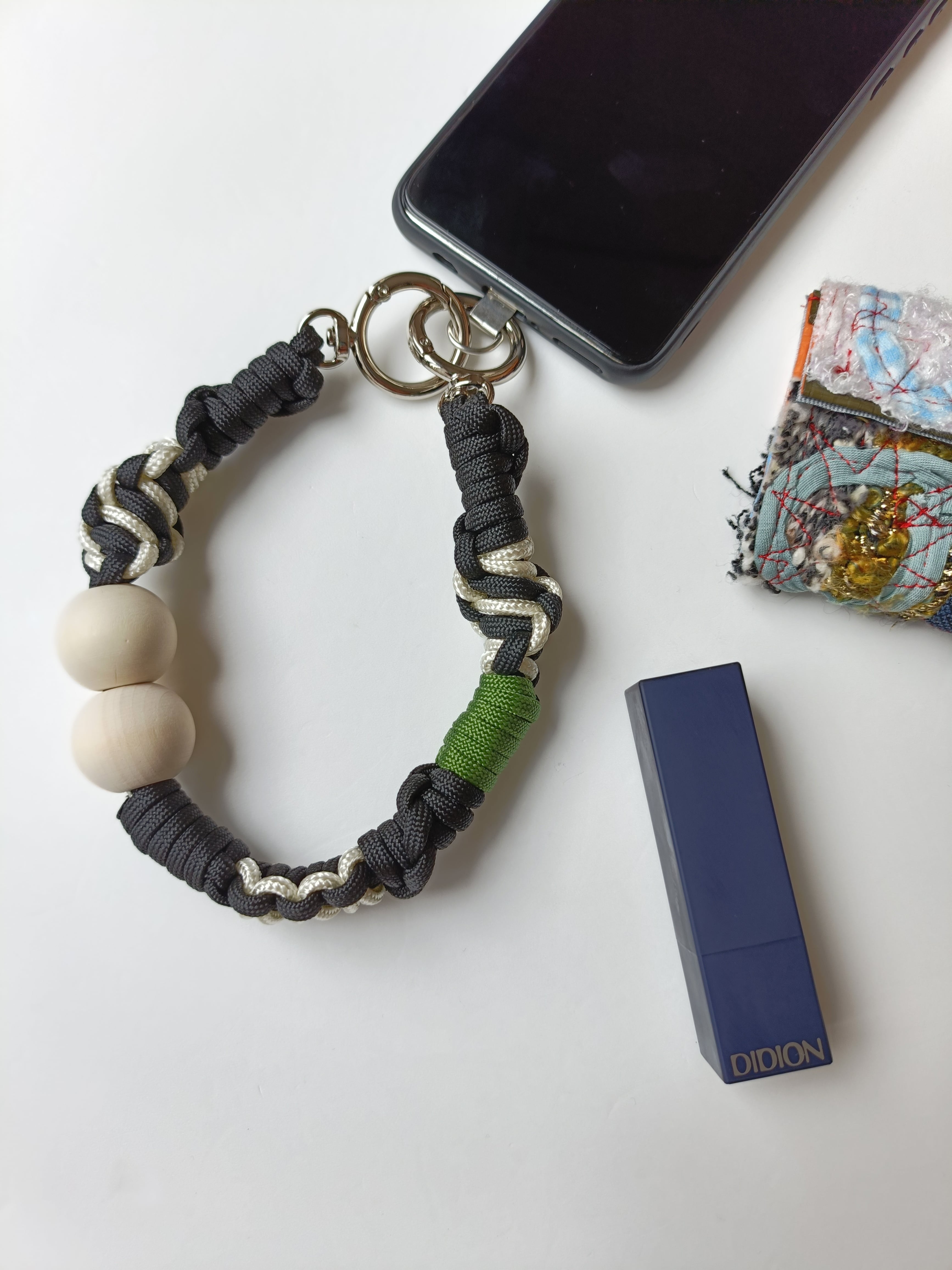 028/ハンドストラップ/パラコード/ブラック×クリーム×グリーン×ウッドビーズ