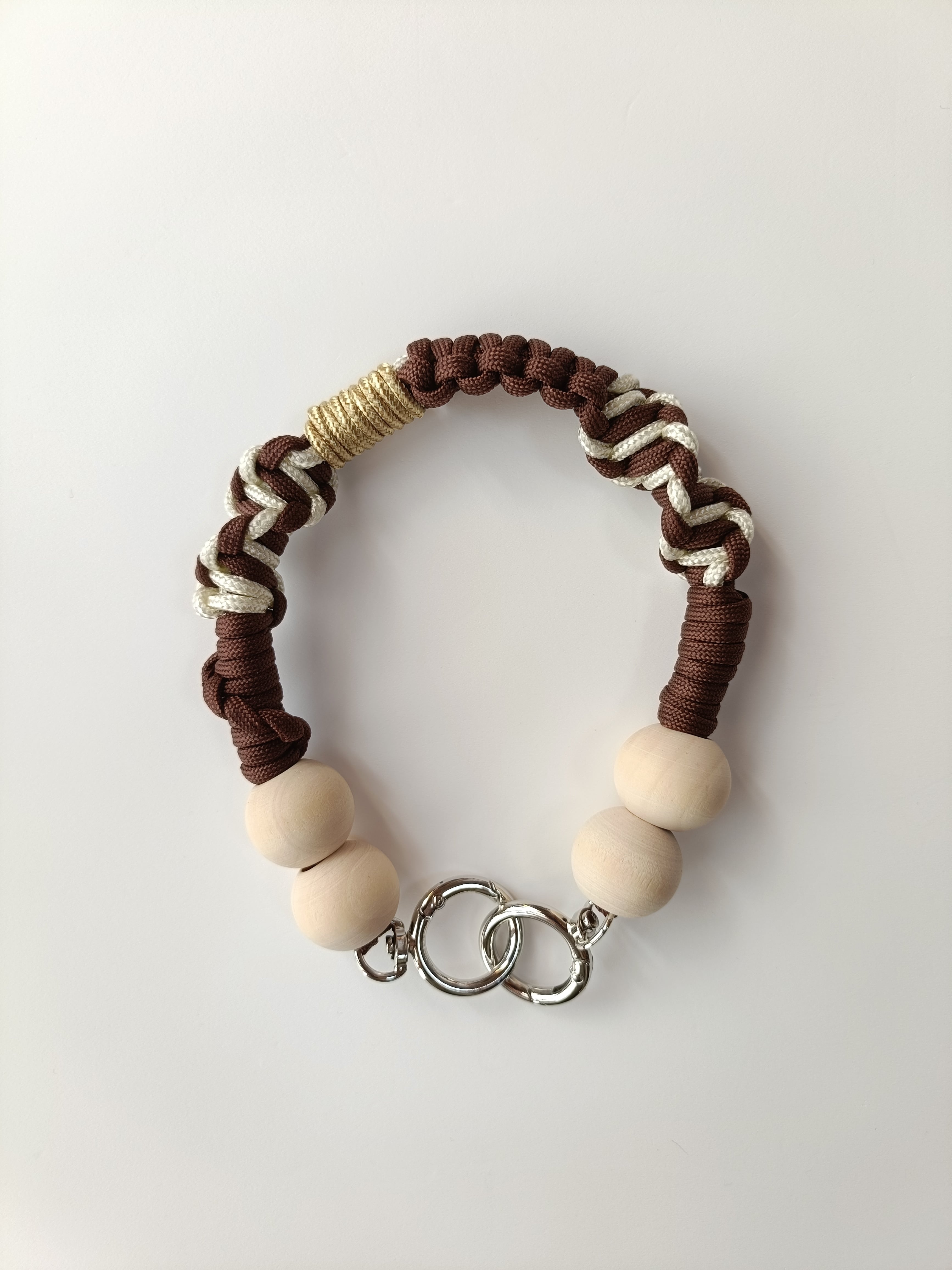 ハンドストラップ033/パラコード/ウッドビーズ×ダークブラウン×クリーム×ゴールド