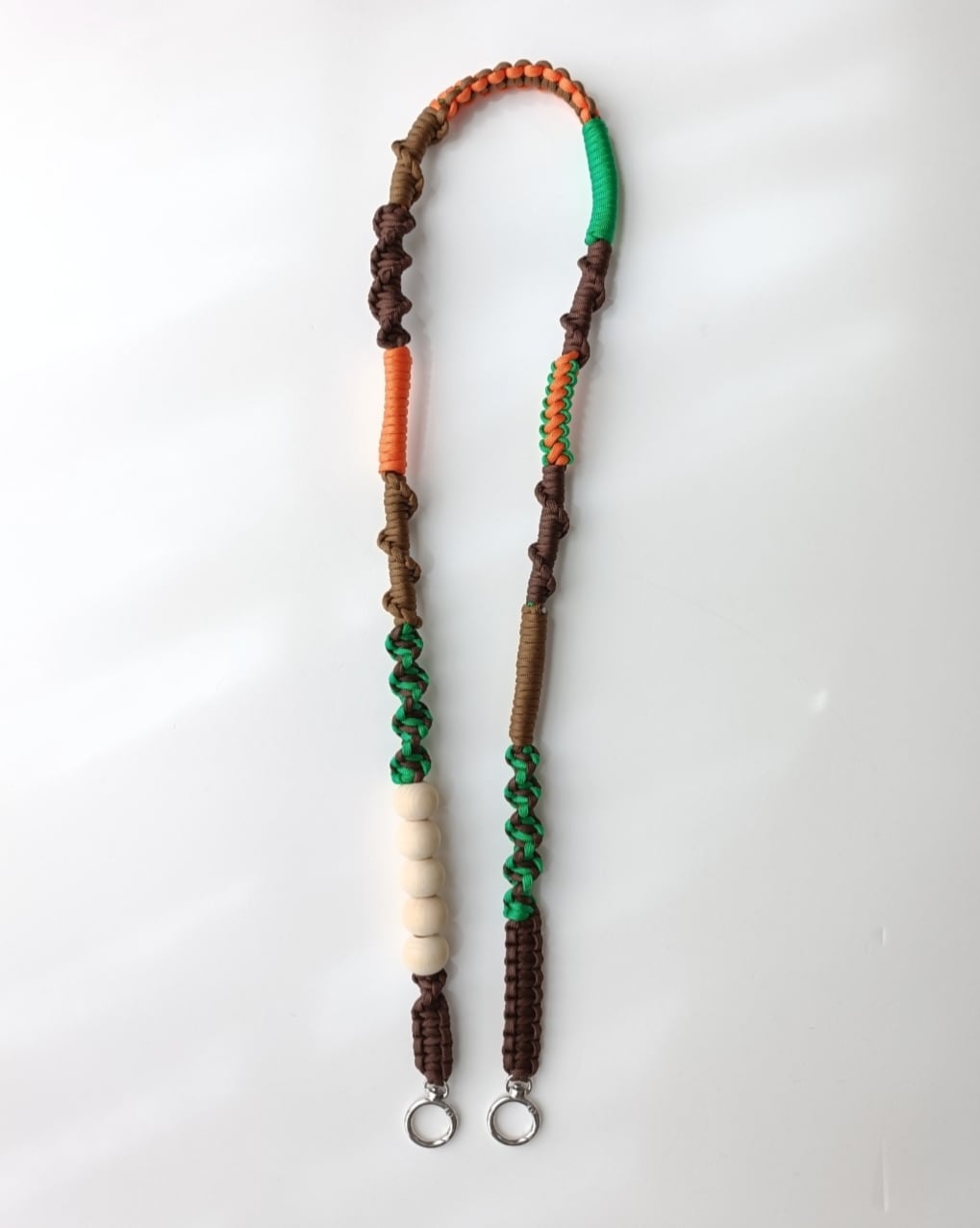 ダークブラウン×ブラウン×オレンジ×グリーン×ウッドビーズの組み合わせは、ブラウンベースの落ち着いたカラーにオレンジとグリーンのスパイスが効いた遊び心があり、季節問わず使えるトレンド感満載のデザインです