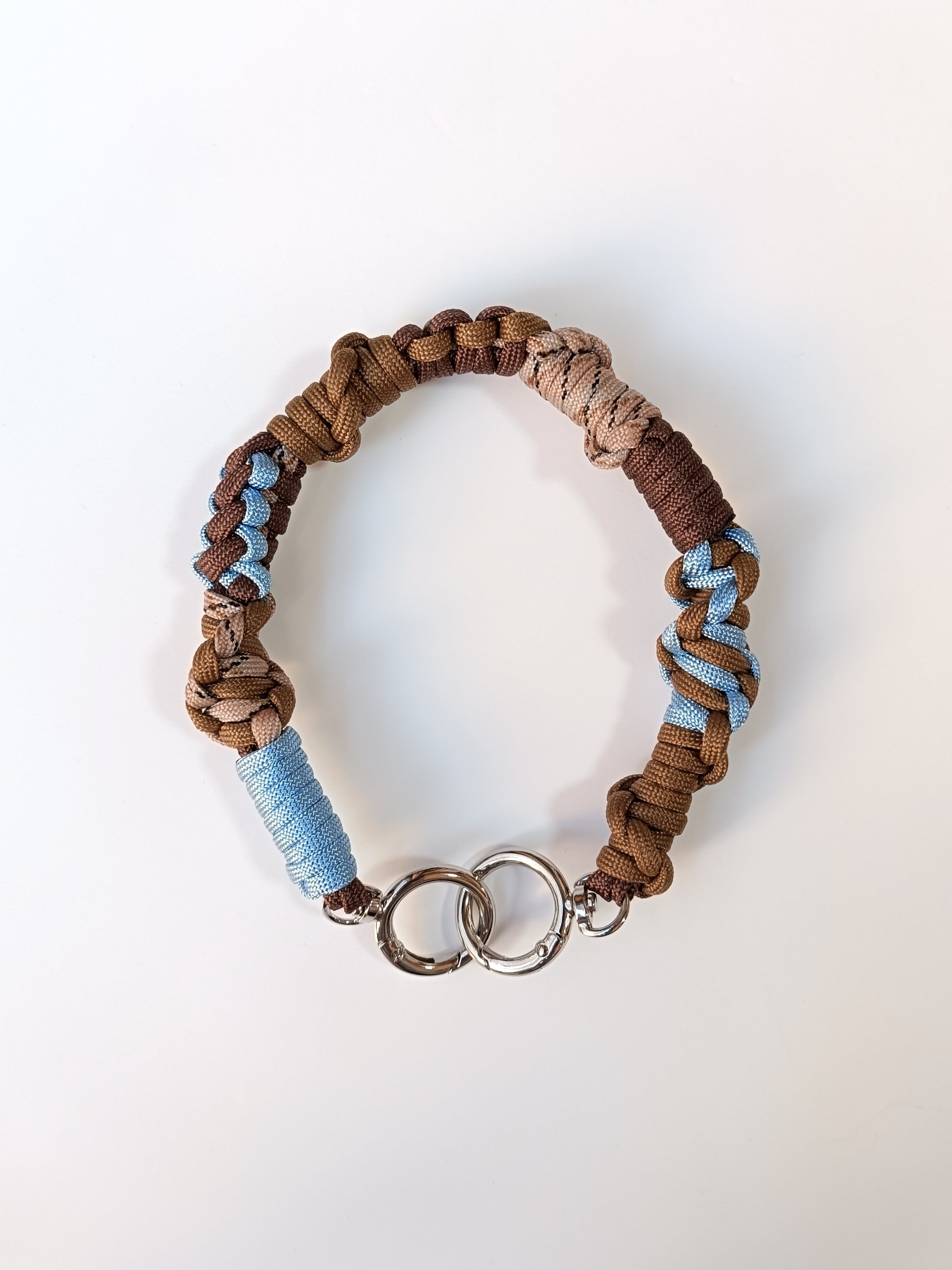 ブラウン×ダークブラウン×スカイブルー×ベージュデザインの組み合わせは落ち着いたカラーにさわやかなアクセントを加えた絶妙なバランスでトレンド感満載のハンドストラップです。