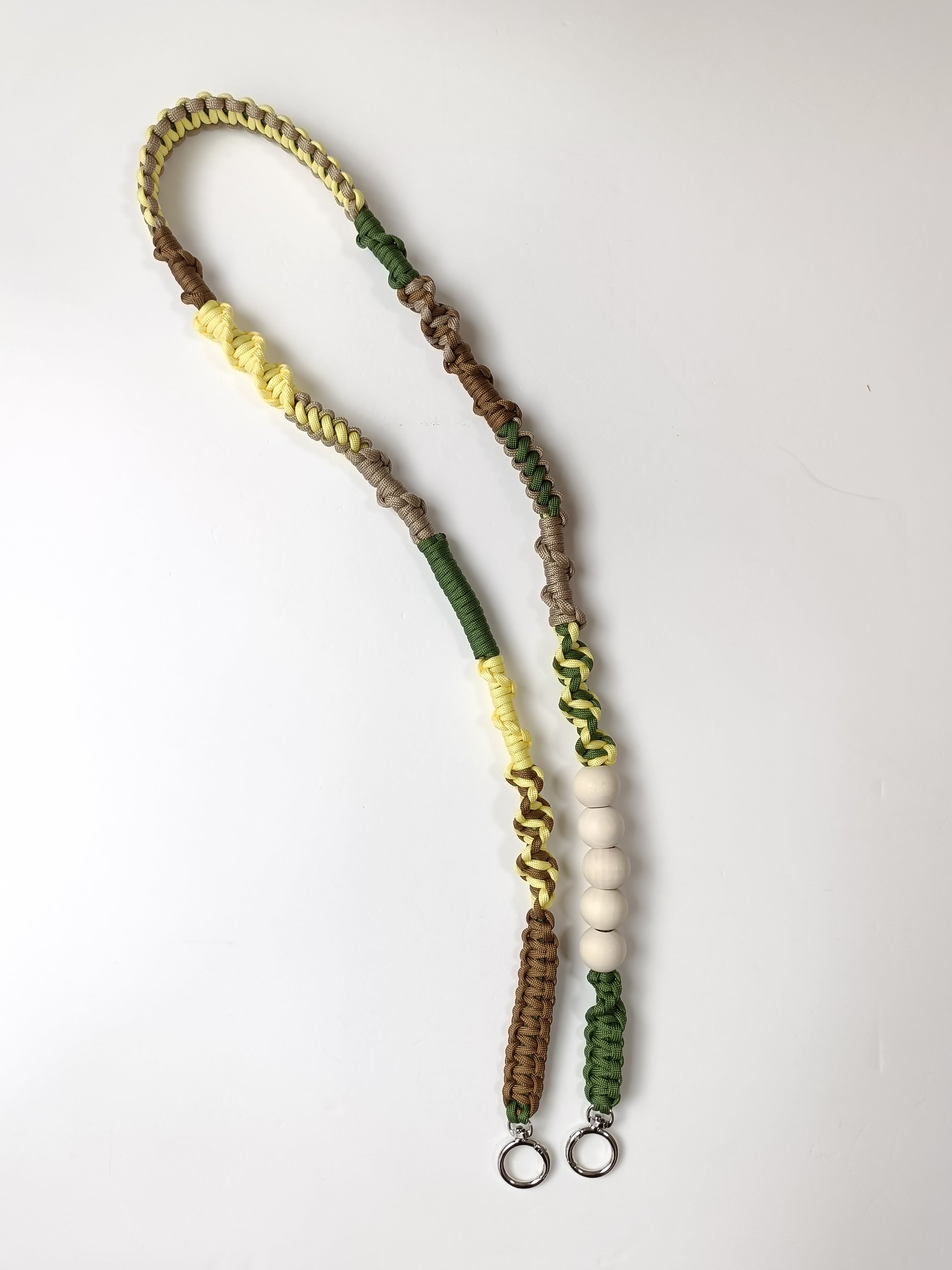 064/スマホショルダー/パラコード/ブラウン×ベージュ×グリーン×バターイエロー×ウッドビーズ
