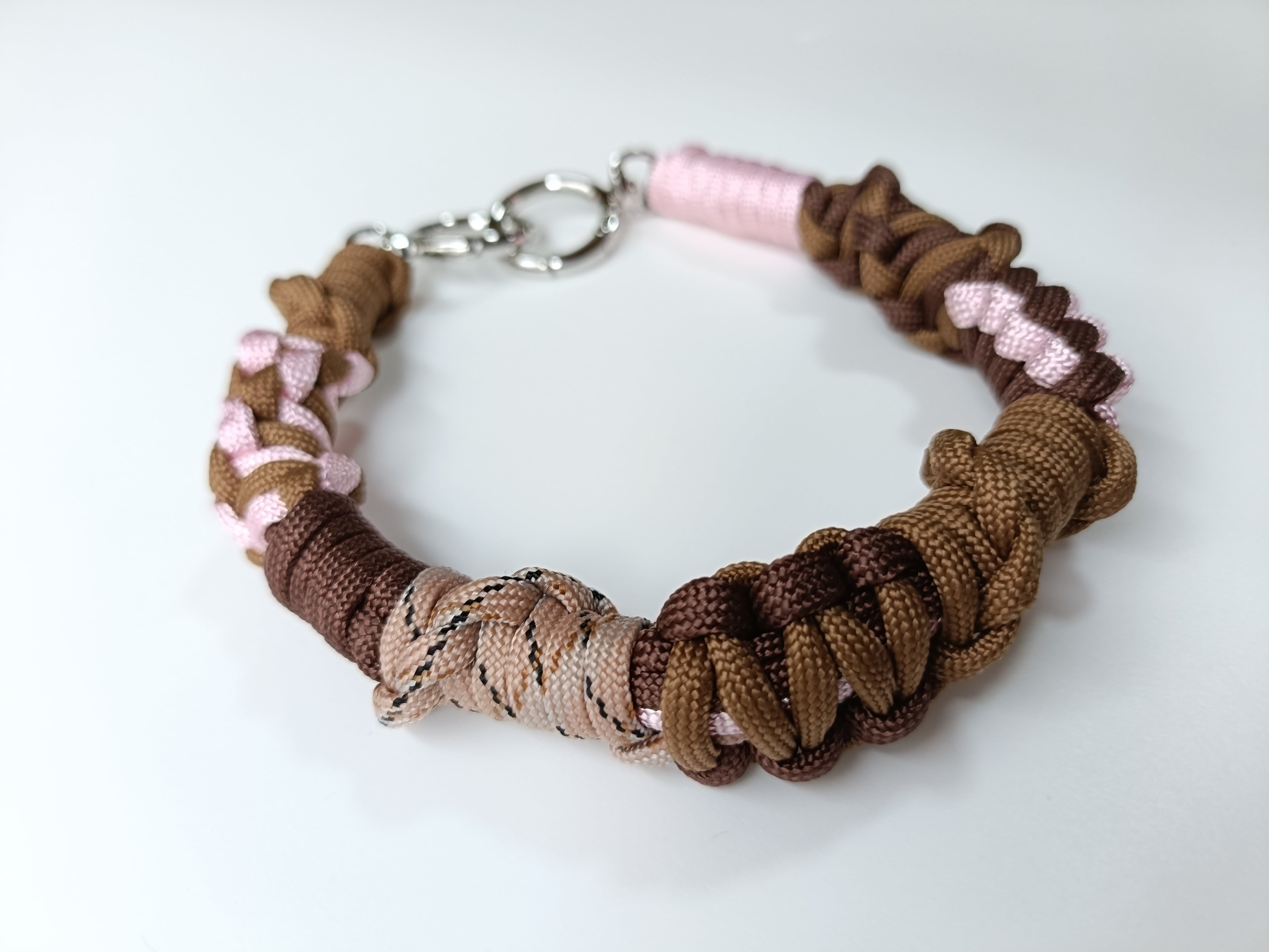 ブラウン×ダークブラウン×ライトピンク×ベージュデザインの組み合わせは落ち着いたカラーにライトピンクアクセントを加えた絶妙なバランスでトレンド感満載のハンドストラップです。