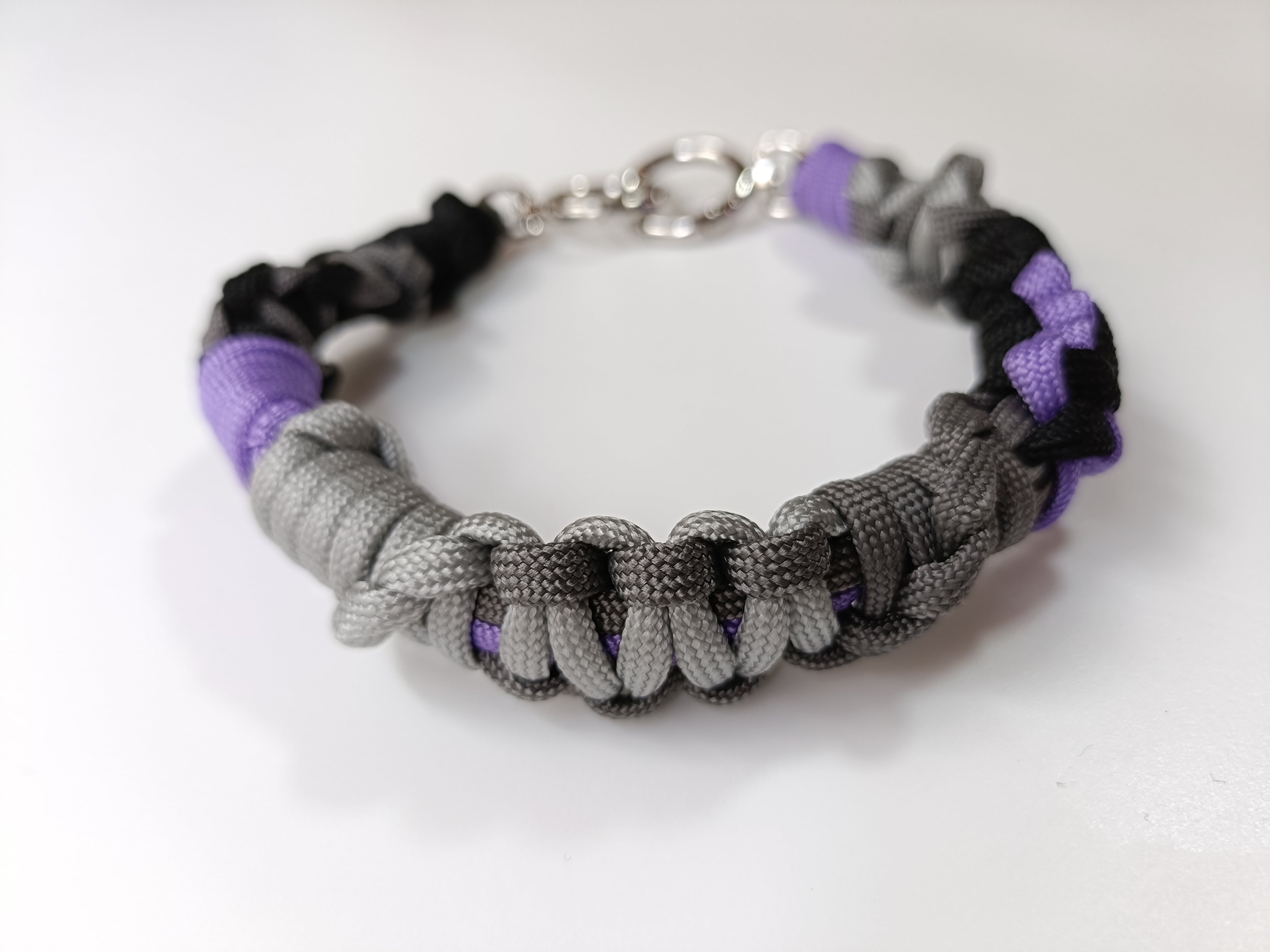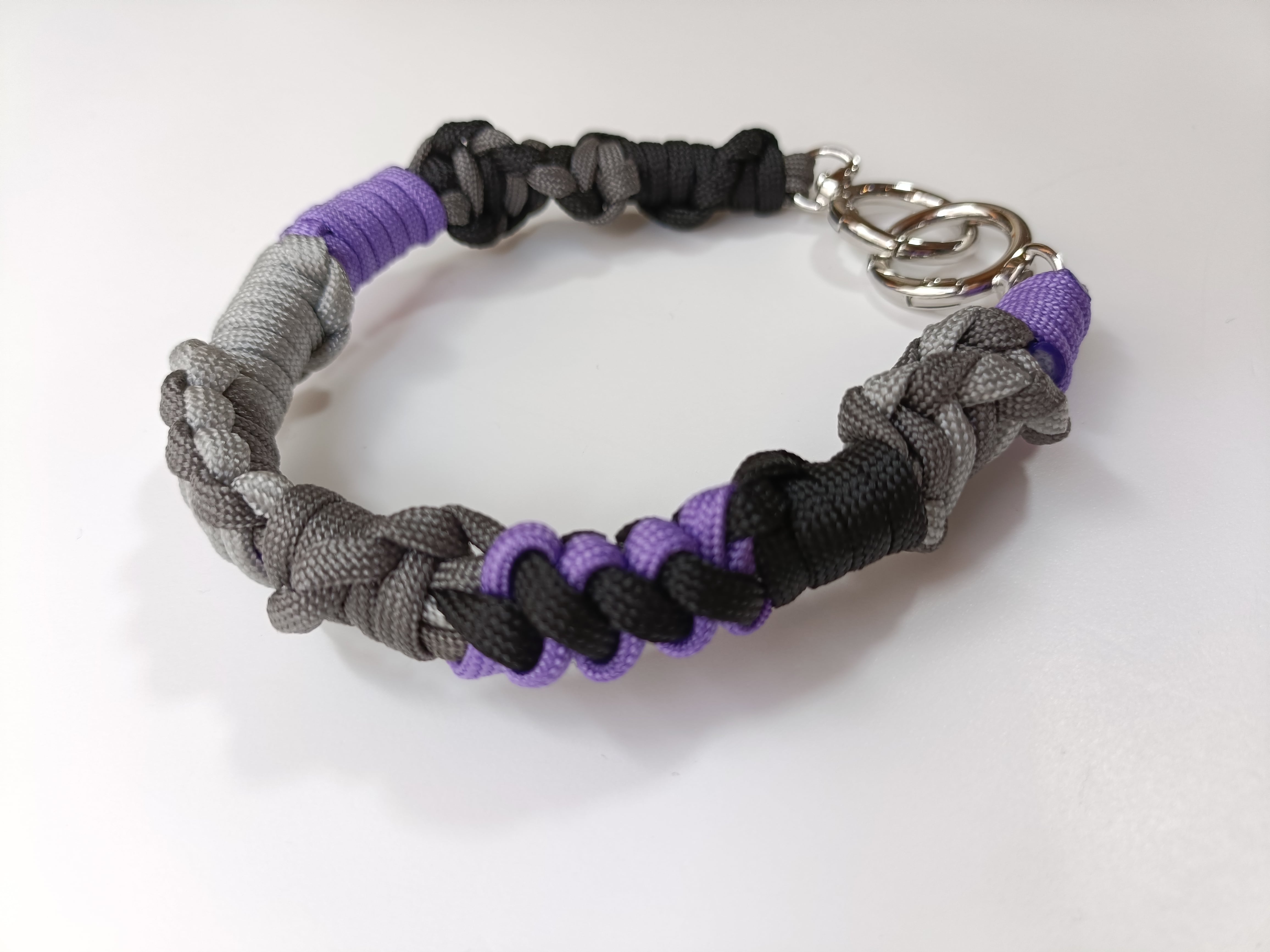 ブラック×パープル×グレー×ライトグレーの組み合わせは、シックで落ち着いた印象を与えながらも、パープルのアクセントが映え、スタイリッシュな魅力を引き立てるハンドストラップです。