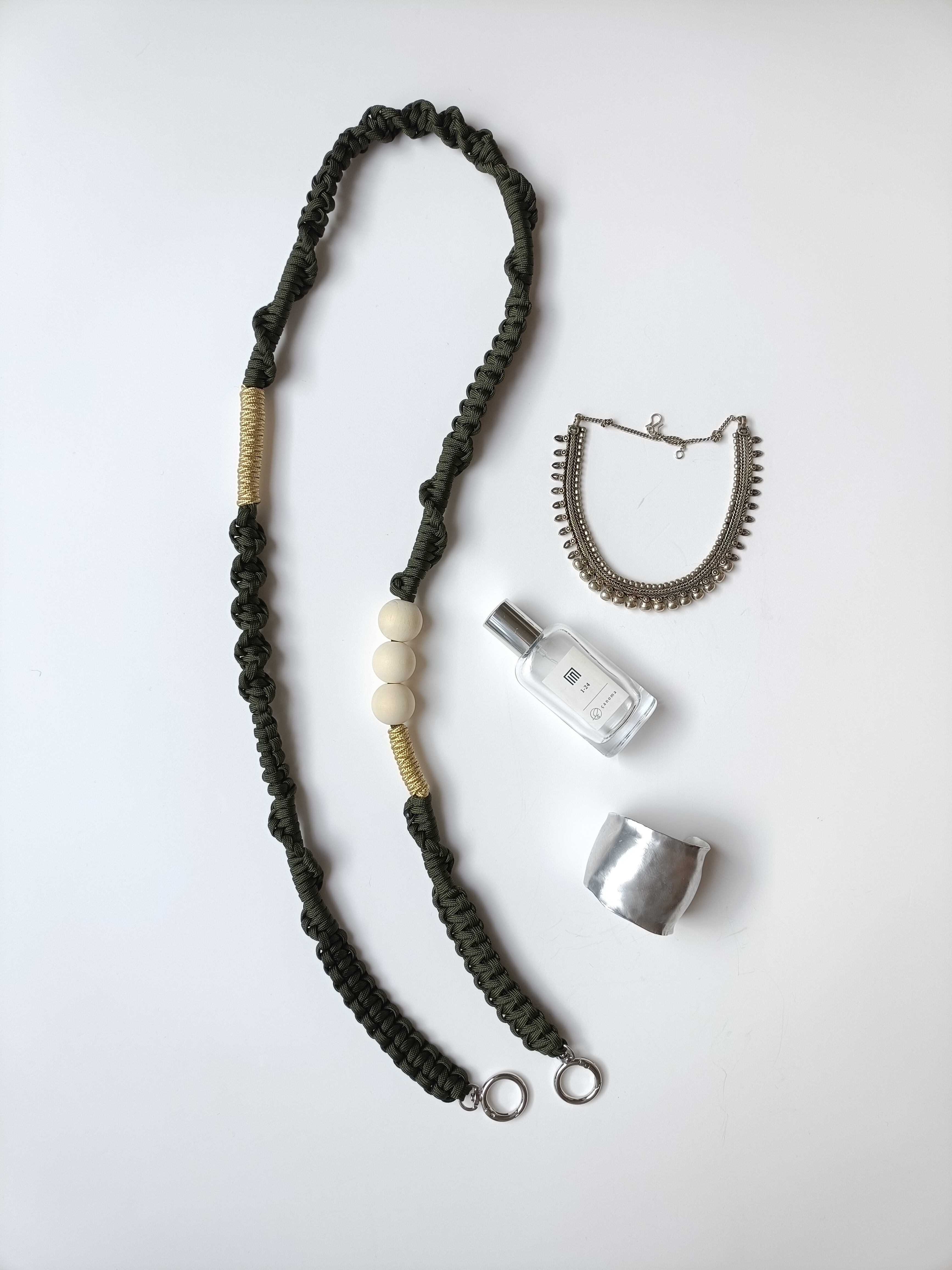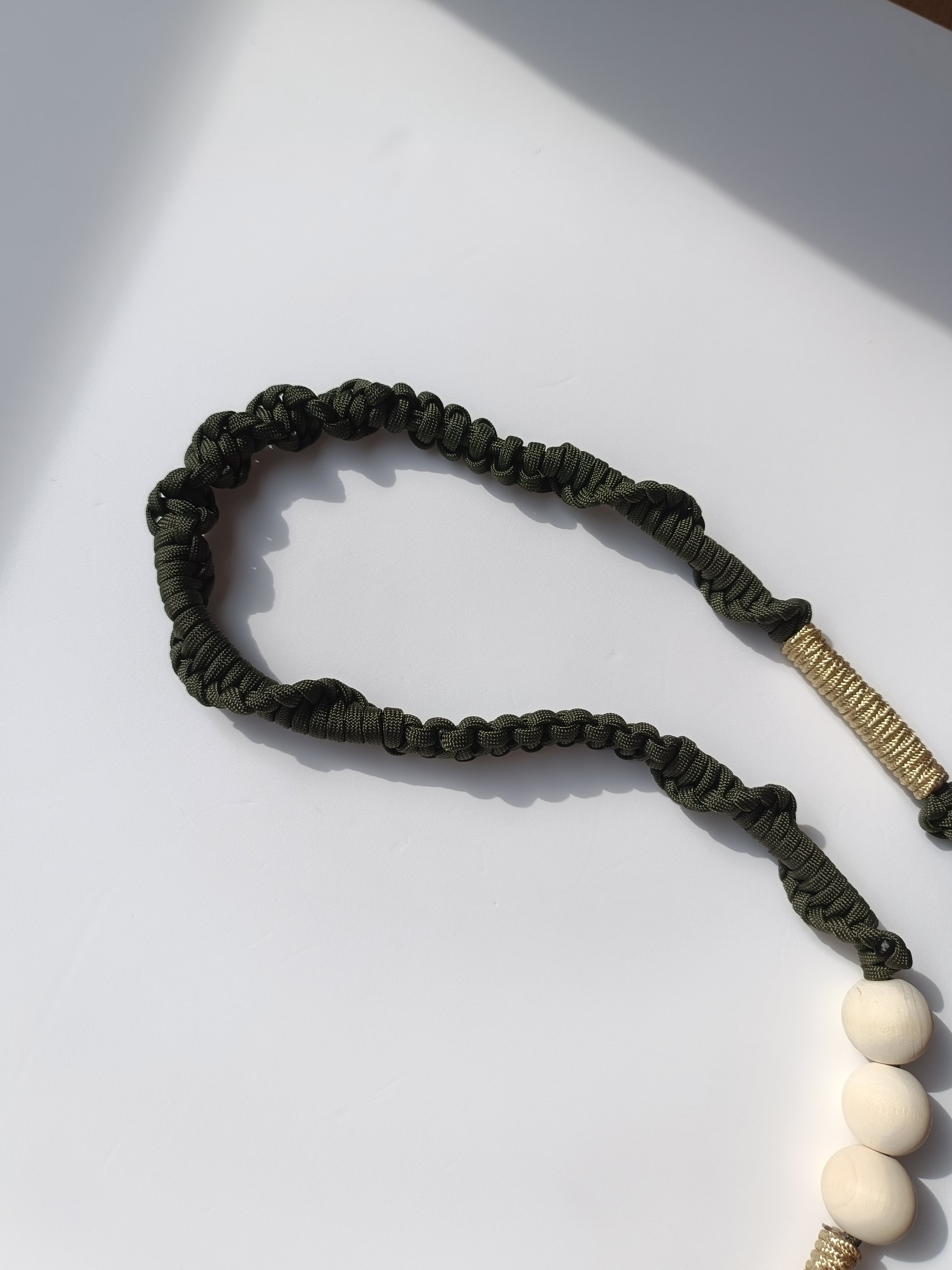 カーキにウッドビーズの組み合わせは、カジュアルながらもナチュラルな印象を与え、日常のコーディネートに絶妙に馴染むデザインです。