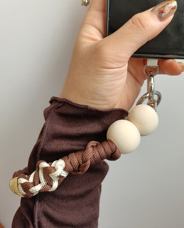 ハンドストラップ002はブラウン×クリーム×ベージュ×ゴールドの組み合わせはシンプルながらもおしゃれな印象を与えてくれるカラーリング。